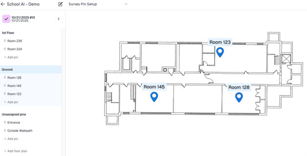 Create and label your location pins, then place them on the map at each spot where you want to capture measurements. For best results, perform a Point Survey at these exact locations, and also run a full Survey using a separate QR code survey. Layering Point Survey measurements on top of the traditional Survey provides richer, more precise data for your Deep Survey.