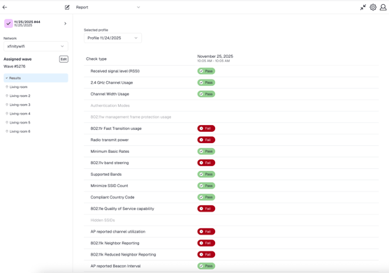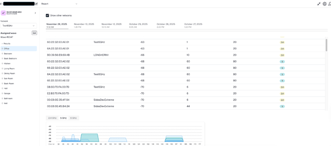 For deeper analysis, any pin can be selected. This will show all the BSSIDs and APs heard at that exact point, along with a historical record.