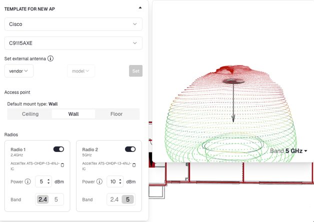Sidos also supports external antennas in your designs. Select an AP model that uses external antennas, then choose the antenna manufacturer and model and click Select. This applies default mounting (ceiling, wall, or floor/desktop) and configures the radios for that antenna profile. You can still adjust radio settings to match your design requirements, as long as they remain within the capabilities of the selected antenna.