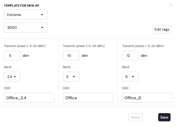 In addition, each band can have its own SSID name if desired. This is where the initial power setting can be made, along with adding any tags.