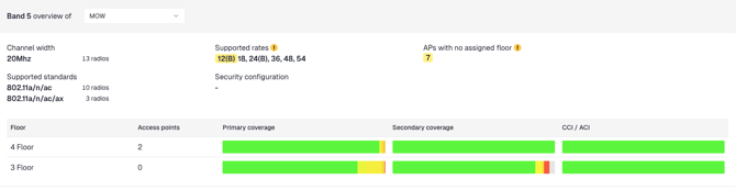 Each surveyed band has a summary view that highlights important details about the survey results and allows you to seamlessly navigate to the specific Floor and Tab by clicking any of the color bars.